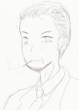 白髪が混じり始めたがっしりした体格の長身の男。若干強面。